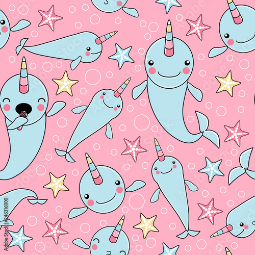 Pattern With Cute Baby Narwhal Or Whale Unicorn Characters