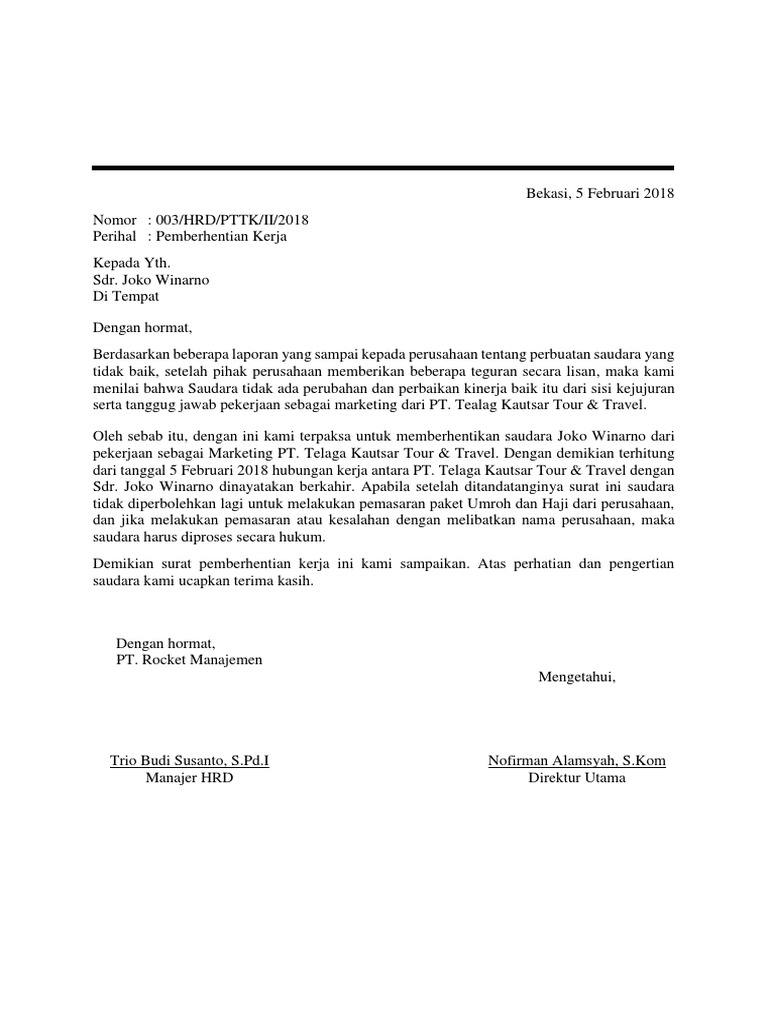Contoh Surat Pemberhentian Kerja - Besar from 0.academia-photos.com Report contoh surat penempatan kerja. Surat pemberhentian kerja sementara merupakan surat yang dibuat perusahaan untuk menghentikan karyawannya sementara. Surat kontrak kerjasama event organizer. Namun dikarenakan satu dan lain hal, suatu perusahaan bisa saja memberhentikan karyawan mereka dari pekerjaan. So please help us by uploading 1 new document or like us to download Surat pemberhentian kerja menjadi bukti otentik untuk setiap karyawan yang diberhentikan, sudah sepatutnya perusahaan memberikan surat ini. Ketiga adalah surat pemberhentian kerja yang sifatnya sementara. Ada 2 versi surat lamaran yang berupa ketikan komputer yang di print atau satu lagi yaitu ditulis tangan.